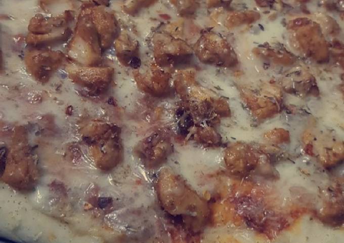 - Phir pizza sauce lgaen or chesse spread kar dein phir chicken add karein or cheese spread karein upar thyme oregano or red crushed pepper sprinkle kar dein.